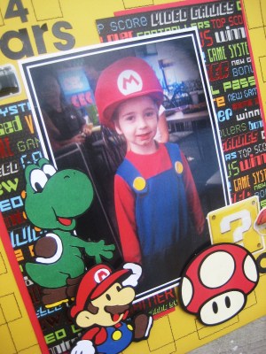 birthday layouts, boy scrapbook pages, chuck e cheese, costume, luigi, mario brothers, paper piecing, retro children's birthday cards, retro video games, toad, toddlers, turtle, video games