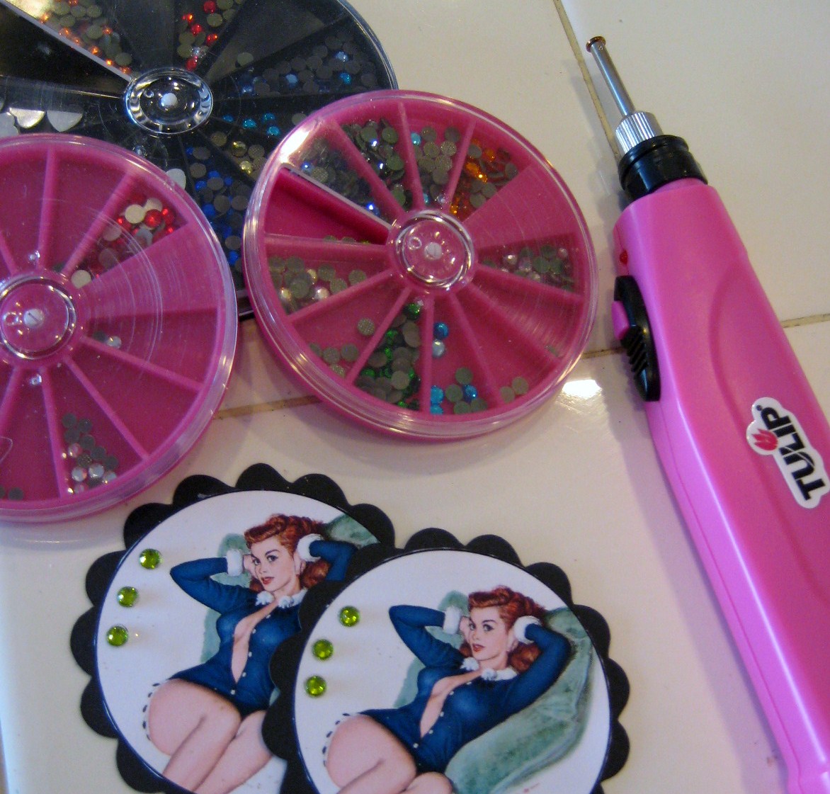 After hot-gluing your image to your scallop layer, add rhinestones.  I heat-set mine with a Tulip heat tool.