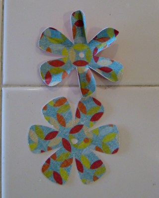 When they are cut, simply fold each layer in 1/2 (folding toward you) so that the edges of each flower petal stand up.  Do that with both your patterned paper and the black flowers.