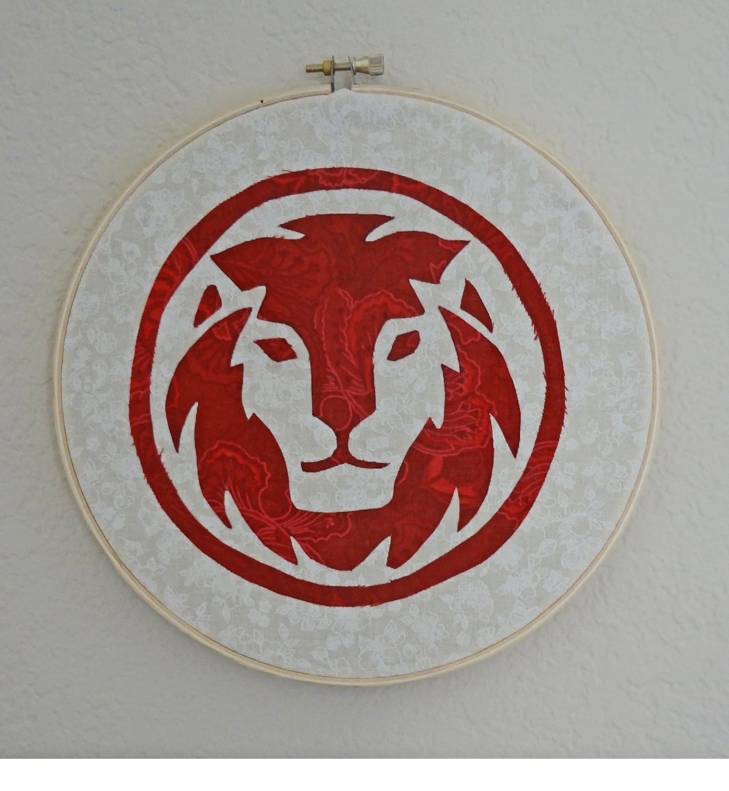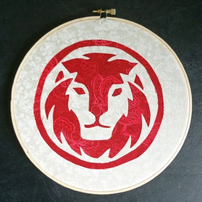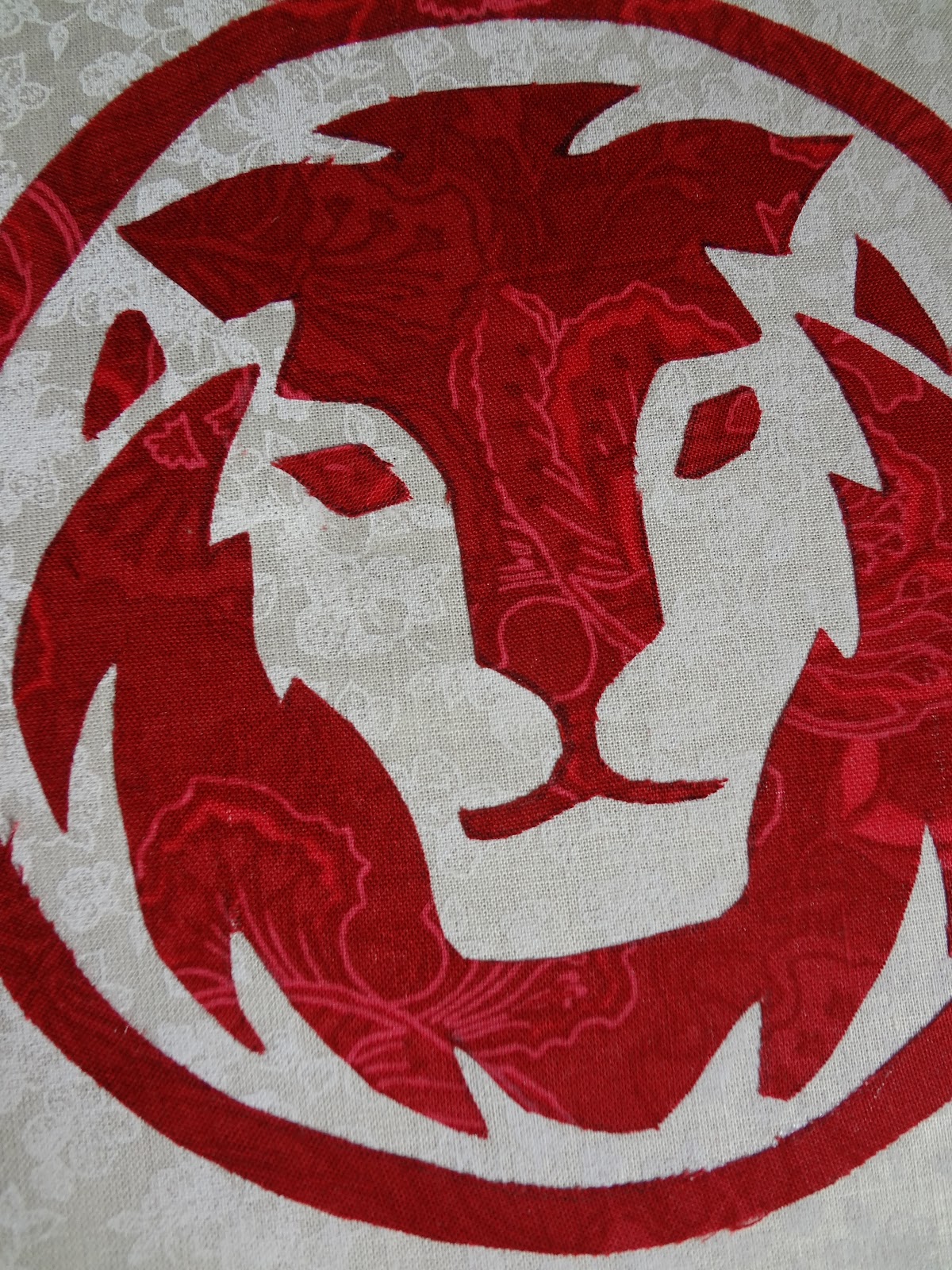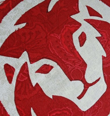 I used some fun fabric that I found at JoAnn.  I attached some Steam-A-Seam to the red fabric and then hand-cut the pattern from the Red Lion logo that I printed on to paper.
