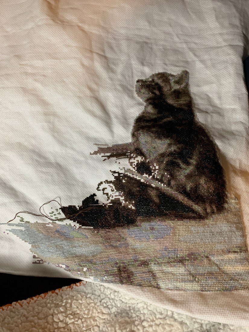 This is a cat and mouse counted cross stitch I was hired to stitch for a customer.