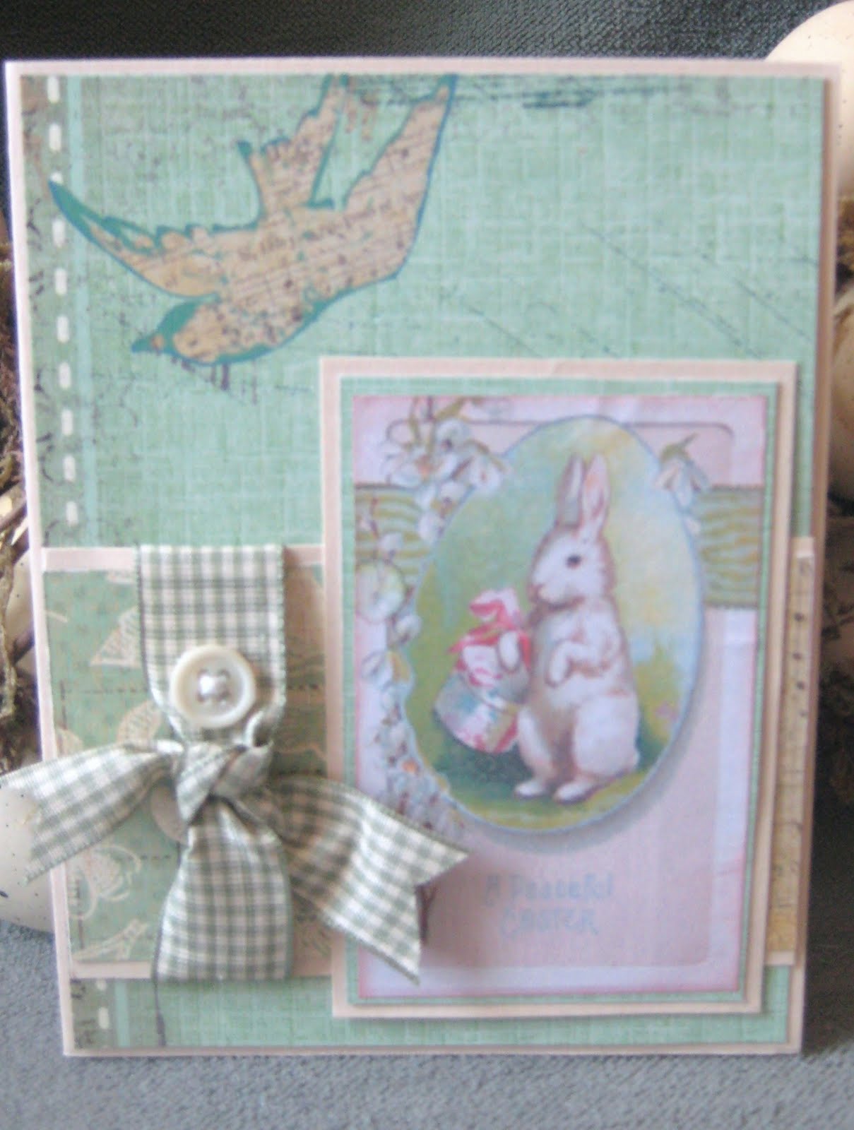 I love walking through the local craft stores and seeing all the happy decor! The background props in these photos is from a cute Vintage looking egg wreath. I think it really adds a little extra coziness to the cards. 🙂