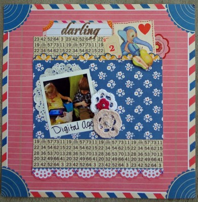 I thought I would make an ironic scrapbook layout to showcase their modern toys by making the page in a Vintage style.
